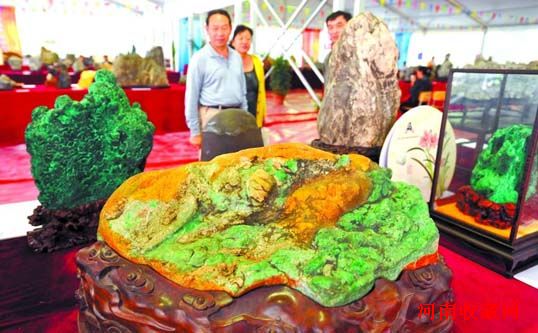 9月24日,中山公园赏石展展厅内,一块翡翠原石吸引了不少人观看,据展出人员介绍,这块石头是个人收藏的,价值4000万元人民币,而且只参加展出不对外销售。9月25日上午 ,第三届山东省城市园林绿化博览会、第九届中国赏石展览会将同时在中山公园开幕。中山公园内的各个园馆都已准备就绪,赏石展展厅内的名石也都已就位,等待市民和游客前来观赏。