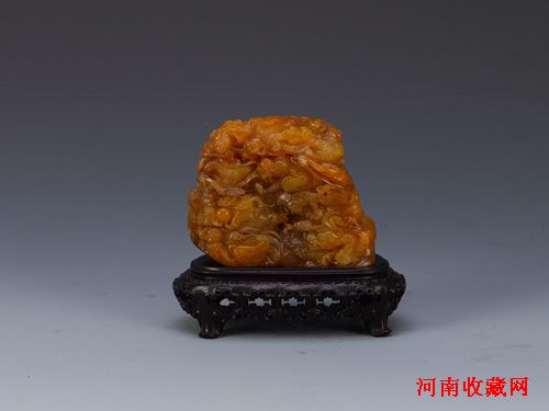 产于福建寿山的田黄石,1500年来,上至皇亲国戚,下至文人墨客,都对其喜爱有加。这不仅是因为田黄的稀缺性,更重要的在于其象征意义这件大田黄冻《龙腾盛世》,为著名寿山石工艺雕刻大师石秀作品,通体用浮雕和圆雕相结合的手法雕刻,四周上下雕九条舞动的巨龙,活灵活现,惟妙惟肖。九条舞龙如游于云端,动作姿态各异,有的昂首腾空,一飞向天;有的回眸远眺,含情脉脉;有的穿梭云海,追逐跳跃;有的摇首摆尾,或隐或现。在上世纪80年代,超过50克的田黄即算成才;如今,随着资源日益稀少,超过三十六克的田黄就算成才。这块田黄冻重达600克,又是名家大师杰作,可谓旷世罕见。