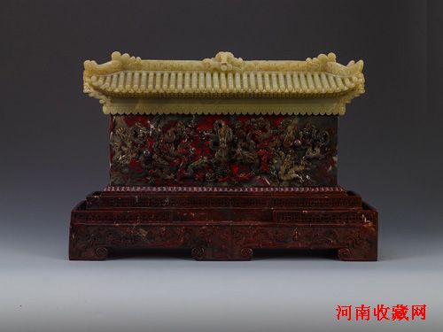 这块鸡血石原石巨大,除用高浮雕方法雕刻九龙外,壁上部还配有整石的琉璃瓦状庑殿式顶,且中国传统宫殿建筑的椽、檩、斗栱一应俱全,堪称一件绝世妙品。而从市场的角度,在2007年北京翰海秋拍上,一件牛克思大师所制的“昌化鸡血石雕楼阁山子”以1344万人民币的高价落槌,创下中国当代工艺品的最高价格纪录。那么,我们再回过头来看这件作品,其价值也就可想而知了。