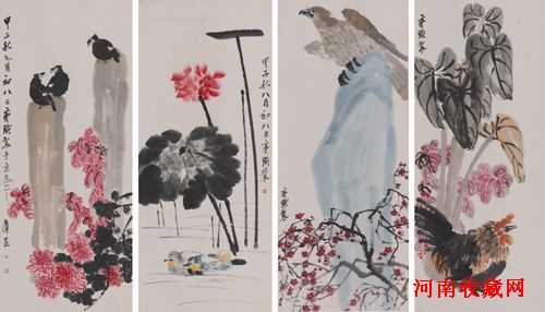 齐白石 花卉禽石 高136cm 宽57.2cm 设色纸本屏风4屏