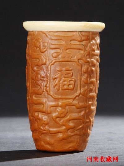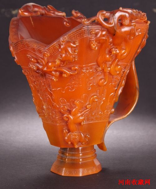 此款为螭虎纹八棱角杯一只,作品不惜材质,选取整角大料制成,将角翻转倒置,截去顶尖部制成杯足,再利用后端凹陷的特点剔清内壁呈八棱杯之型。杯体色如浅栗,杯口沿微敞,一侧翻卷成流,高足部收敛。杯柄由整料镂刻而得,雕有螭虎纹饰,杯口雕有双螭纹,气势雄健,生动活泼。此杯造型古朴大气,纹饰细腻,刀法简洁流畅,可为精品。