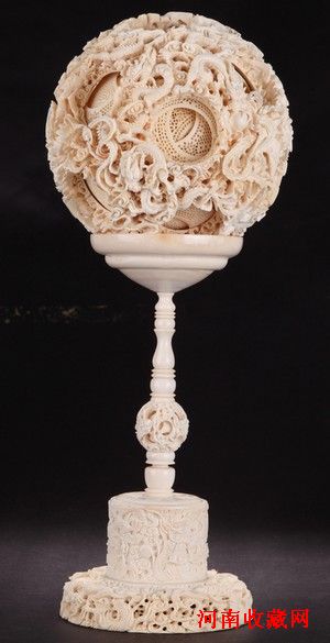 牙雕套球又称“同心球”、“鬼工球”,取鬼斧神工之意,制作相当繁复,工艺要求极高,在传统牙雕工艺中占有重要地位。象牙球交错重叠,玲珑精致,表层镂空雕刻云龙纹饰。球体从外到里,由大小数层空心球连续套成,虽从外观看来只是一个球体,但层内有层。套球中的每个球均能自由转动,并且象牙球中任意一层套球均雕有精美繁复的纹饰。套球表层雕刻较易,但刻镂内层许多球体时,因空间限制,雕制十分困难,此器套球层数可至三十余层,其中雕刻技法的繁复可见一斑。