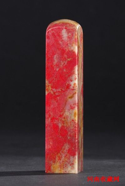 此款昌化鸡血石方章素雅且不施雕琢,取其自然纹饰,自成一幅画面,血色鲜亮、红艳,走势自然,十分精美。