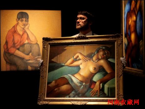 工作人员正准备悬挂埃及艺术家马哈穆德•赛义德(Mahmoud Said)的人像画作《戴珍珠项链的女人》(Nude With A Pearl Choker)。