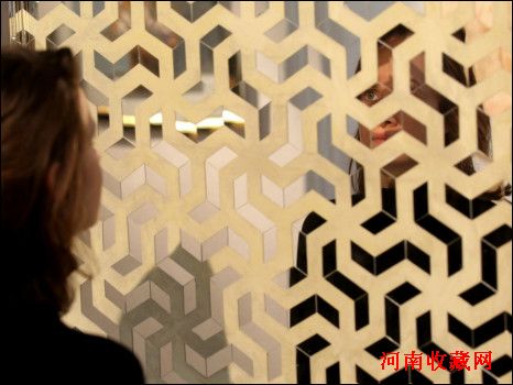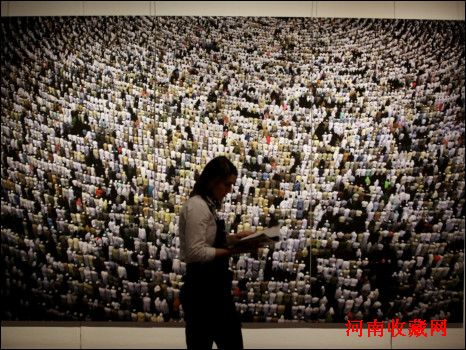 一位员工正在欣赏伊朗女艺术家蒙妮尔•法曼法玛妮(Monir Farmanfarmaian)的无名作。本次拍卖以阿拉伯与伊朗艺术为主题。