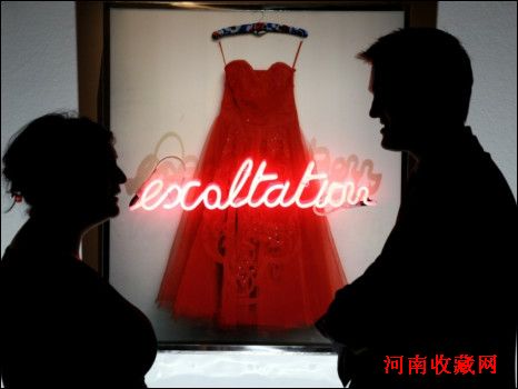 两位参观者在艺术家多拉•多伊卜(Dora Dhouib)的作品《兴高采烈》(Exaltation)前交谈。拍卖将于10月20日在伦敦举行。
