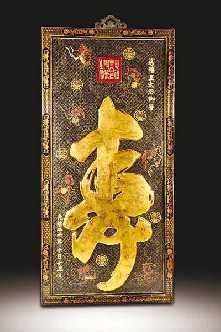慈禧太后60大寿贺匾“慈禧皇太后御笔.黑漆描金寿字纹挂匾”,估价介乎300万至400万元港币。