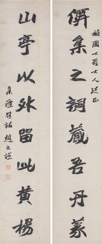 前“海派”书法代表人物赵之谦《书法联》,赵之谦在书法造诣上对各种书体都涉猎并且留下了为数众多的优秀作品。以行书作品为例来看,能将篆、隶、楷等书体的凝重融于这种飘逸洒脱的行草书之中。此幅书赠“梅圃”,即舒梅圃,赵之谦的好友,在杭州开鼎和当铺,赵氏在江西为官期间,二人多有书信往来。此联虽自题集瘗鹤铭,然全是自家面目。以北碑笔法写出,却能得飘飘欲仙之气。