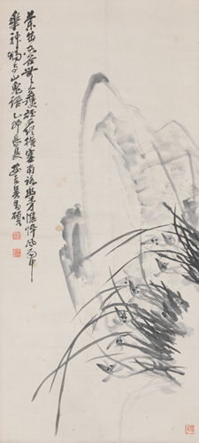 后“海派”代表人物吴昌硕的《兰石图》,纯用水墨,用笔古拙却生意盎然,融入篆隶金石之法,线条老辣遒劲,实是书法大家的得意画作。