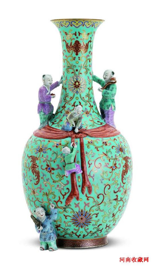 随着近几年中国明清宫廷艺术品在全球范围内收藏热潮的升温,作为御制艺术品的典型代表器物——瓷器、珐琅、漆器、铜器、木器、牙雕和百宝镶嵌等器物的价格也将水涨船高,各地区艺术精品屡现拍卖天价。本此巡展中皇家重宝迭出,乾隆时期的粉彩精品一直以来都是市场炙手可热的珍品,创出天价的拍品也往往集中在这些粉彩珍品上。《松石绿地粉彩花卉纹五子登科敞口瓶》、《松石绿地粉彩八吉祥小天球瓶》,胎体细腻,色泽亮丽,工艺精美,为乾隆时期的官窑瓷器精品。此外,清乾隆青花四季花卉纹六方贯耳瓶、清乾隆茶叶末釉双龙耳汉壶尊等都为乾隆官窑典范。珐琅器中人物像很少,童子的形象更是罕见,本专场推出的一对《御制铜胎掐丝珐琅童子》,代表了清康熙搯丝珐琅工艺最高水平。《铜胎画珐琅西洋人物渣斗》,受到了郎世宁西画风格的影响,是乾隆画珐琅工艺的最杰出代表。《铜胎嵌珐琅百寿纹八吉祥大瓶》是一件乾隆时期不多见的大件鎏金嵌珐琅瓶,相当难得。清乾隆《御制鎏金八宝纹座钟》,内部机械为西洋进口,机械蕊心使用珍贵红宝石零件,为乾隆朝少见御制自鸣钟精品。清乾隆《雕漆“红楼梦”人物故事小柜》(一对)、《雕漆嵌百宝葫芦大吉挂屏》将乾隆宫廷雕漆艺术的最高水平诠释的淋漓尽致;清乾隆《铜寿字纹竹节耳敞口尊》、清中期《象牙编鱼篓》、清康熙《紫檀嵌百宝松鹿图盖盒》……都堪称清代宫廷艺术的不朽之作。
