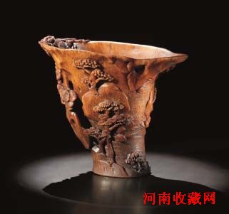 以浮雕遒劲苍松为杯柄,枝干攀升直至杯口,杯柄右侧浮雕有江边怪石青松,杯柄左侧上部雕山岩青松,浮云寥寥,下部为小舟隐于树叶之后,船中有对坐人物相谈甚欢。