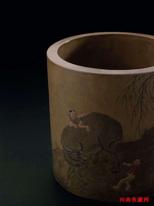 紫砂器中笔筒属文房用品,在明清时期,地位要远高于其它紫砂器具,被视为珍品,此件“杨季初制泥绘牧牛图笔筒”的独特之处在于用色泥描绘而成,颇具难度,作者杨季初为清乾隆时一代大家,其泥绘作品曾一度入宫,被皇室珍爱。杨季初泥绘笔筒传世仅有三只,一只现为南京博物院藏,一只为苏州博物馆馆藏,流传于世的仅此件孤品。