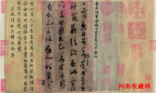 到了清朝,该帖又为大鉴藏家梁清标收得,梁氏的鉴赏眼力及收藏之富甲于天下,隋展子虔《游春图》、唐阎立本《步辇图》乃至顾闳中的《韩熙载夜宴图》等都是他箧中之物,他在草书《平安帖》拖尾钤有“蕉林梁氏书画之印”、“棠邨审定”两方藏印。梁清标死后,草书《平安帖》与他的绝大多数藏品一起成了皇家藏品。乾隆五十五年四月,乾隆在黄绢后隔水上为此帖做了释文,又在后面书写了“可亚时晴帖”五字,将草书《平安帖》与自己最喜欢的《快雪时晴帖》相提并论。随后,该帖被编入《石渠宝笈?续编》。