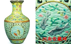 清代乾隆粉彩镂空瓷瓶(左)成为最贵的中国艺术品,该瓷器的瓶身上有两只鱼嬉戏的图画(右)。