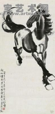 此幅《奔马图》作于1948年初冬,其时中国人民解放军发起三大战役,傅作义部接受了中国共产党的提议,北平和平解放在即。徐悲鸿与吴作人、艾中信、董希文等筹备建立“一二七艺术学会”,以迎接北平和平解放这一历史时刻。《奔马图》即为画赠当时北平新华总社记者,后来中国著名的史学家、中国的美国史研究第一人的邓蜀生先生的。画面用笔纵放淋漓,但造型结构却十分严谨。既充分发挥了中国传统写意画的简洁与凝练,又结合西画的块面与光影,把马的形体表现得十分强健而丰腴,纵横驰骋,气势磅礴,观之使人备感精神振奋。同齐白石的虾一样,徐悲鸿笔下的马已经成为中国近现代美术宝库里极其辉煌的一笔。(博宝艺术网评论员 李亚菲 撰文)
