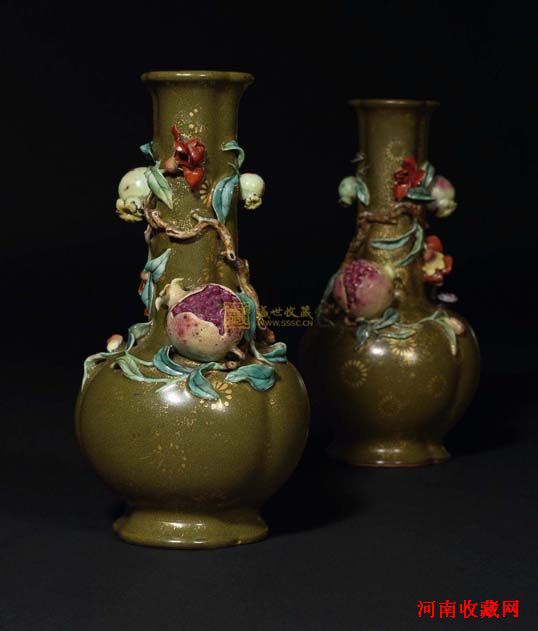 这对瓶高20.5厘米,估价800万至1200万元,经过多轮叫价,最终以3100万落槌,加上佣金,成交价高达3472万元,夺得全场成交桂冠。此对瓷瓶流传有序,曾于1977年5月16日在香港苏富比上拍,编号214。两瓶器形相同,唯堆贴构图有别,图样如镜像,相伴成趣。瓶体以洋金铺锦地,用五月石榴花果堆贴,艳丽瞩目,与景德镇常见粉彩不同。比较一件北京故宫博物院所藏“酱地描金凸雕灵桃瓶”,造型、纹饰相类似,该作品曾收录于《故宫博物院藏文物珍品大系—珐琅彩•粉彩》,保存至今尤为难得。