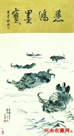 作为“北纬”秋拍一件重要拍品徐悲鸿的《五牛图》,采取平远构图,撷取景物十分简洁,近处几丛芦苇,五头水牛由近及远浮于水中。画面依次展开,至远处水天相接渺不可见,在咫尺画面上再现了烟波浩淼的广阔天地。水牛躯体的肌理和骨骼把握得很精确,造型生动。一只牛侧着脑袋,凫水时的舒适享受的神态表现得十分传神,牛背上垂首站着一只鱼鹰,张开的双翅正待收拢。整件作品,在抓住水牛骨干肌理和神态动作的同时,又准确捕捉了动物形体的瞬间动态变化,运用高质量的线条贯通,骨法用笔的连贯,将所描绘物象自身外溢的气质,自然而洒脱地流注在画面上。