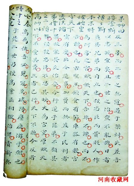 河南商报鉴宝专家安顺说,从字体的变化看,应该不是一天抄成的,而是每天写上数页。除了小楷抄书,在书的留白之处,还有作者对抄写内容的点评,此外书中还有很多的红色小圆圈,这些小圆圈部分承担着“句读”的作用,也就是现在的标点符号,而另外一些是抄书人在强调一些字句。“想必他不仅认真地抄了这些内容,闲暇时候还反复阅读,将自己的感悟都写在抄本上。”藏友王先生非常喜欢这个抄本,平常拿在手中反复把玩。