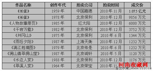 2010年秋拍中国嘉德的“长征――大师们的笔墨征途”专场中,李可染水墨巨制《长征》以1.075亿元成交,这幅作品的拍卖成绩是继齐白石、张大千相继创出近现代书画高价之后,创下的中国近现代书画新纪录。