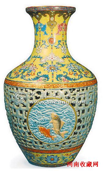 清乾隆多色釉镂空“吉庆有余”转心瓶,内绘青花,外画洋彩、珐琅彩、粉彩,运用描金、镂空、转心、浮雕等多种工艺,极尽奢华,属于清代乾隆瓷器中的精心之作。2010年11月11日伦敦拍卖行班布里奇斯(Bainbridges)在伦敦郊外一个仓库里举行的一场私人遗产拍卖上,此瓶以5160万英镑(约合5.54亿元人民币)刷新中国工艺品拍卖世界纪录,亦为中国文物拍卖的最新纪录。
