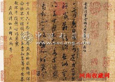 图二:晋王羲之草书《平安帖》(后世摹本),又名《告姜道帖》,绢本,最早见于北宋《绛帖》,后经《宣和书谱》著录,当时共有九行,后被一分为二,此为前半部,纵24.5厘米,横13.8厘米,保留了前四行计41字。该帖经乾隆二次题识并著录于《石渠宝笈续编》,乾隆盛赞该帖“可亚时晴”(《快雪时晴帖》)。在中国嘉德2010年秋拍上以3.08亿元人民币成交。