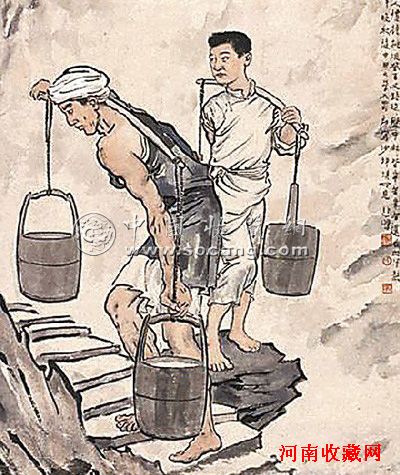 徐悲鸿中国画《巴人汲水图》(局部),高300厘米,宽62厘米,创作于1938年,是一幅真实记录民众生活景象的艺术珍品,为徐悲鸿的代表作之一。构图匠心独运,将巴人汲水的场面分解为舀水、让路、登高前行3个段落,并以江岸的岩石和层层石阶贯通其中。在北京翰海2010年秋拍上,作品以1.71亿多元人民币成交,刷新了徐悲鸿个人作品拍卖纪录,打破了中国近现代书画拍卖纪录,也创下中国绘画拍卖成交世界纪录。