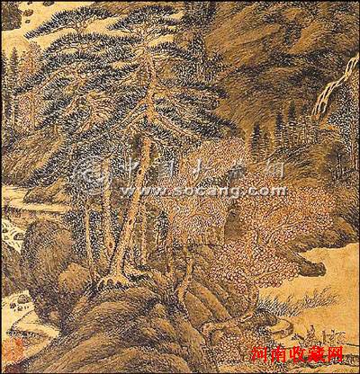 元王蒙《秋山萧寺图》(局部),先后著录于明代《珊瑚网》、清代《佩文斋书画录》、《式古堂书画汇考》、民国《虚斋名画录》。此作以五代南唐董源、巨然为宗,取“北宗”崇山峻岭之构图,取“南宗”抒情写意之手法,在层峦叠嶂、丘壑深密的苍茫中寻求心象表达,以“繁线密点”将境界表现和笔墨形式有机地统一起来,追求主客同一、物我相融的境界,其中既有对传统技法的延续,也有时代新风下的创变,在北京保利2010年春拍中以1.36亿多元人民币成交。