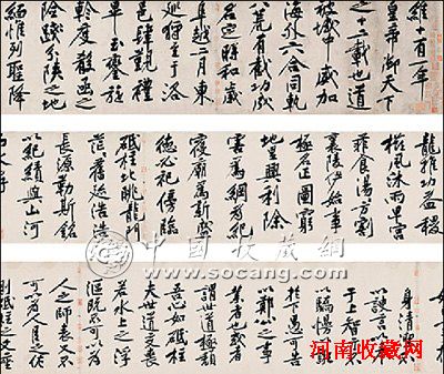 图五:北宋黄庭坚《砥柱铭》手卷(局部),纸本行楷,无年款,高37.6厘米,长824厘米,内容为黄庭坚生前敬仰的唐代宰相魏征的《砥柱铭》,全文600多字。原为日本有邻馆收藏。于北京保利2010年春拍中以4.36亿多元人民币成交,目前为中国书法艺术品拍卖世界纪录。