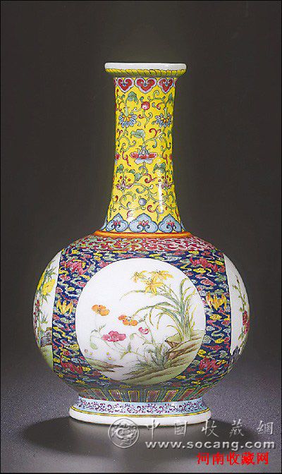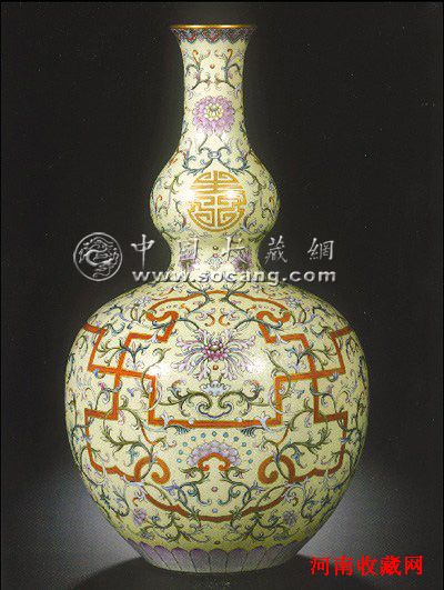 清乾隆浅黄地洋彩锦上添花“万寿连延”图长颈葫芦瓶,清代装饰工艺“轧道锦地”的杰作,以细针状物在釉面上刻画纹饰以表现“锦地”效果,所绘纹饰色泽艳丽,重叠交错,细致缤纷。该瓶在香港苏富比2010年秋拍上,为香港收藏家张永珍以2.52亿港元购得,约合2.2亿元人民币。