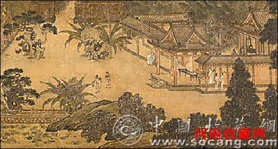 宋佚名《汉宫秋图》手卷(局部),设色绢本,著录于《石渠宝笈续编》,为南宋初宫廷院画佳作,有乾隆御题的引首和四首御题诗。此作以汉武帝甘泉宫候驾西王母为题材,绘殿宇回廊、池桥河汀、湖石舟楫,其间人物聚离动息,各自顾盼,气息幽倩,古意盎然。其典雅工丽的风格,沉稳劲峭的技法,颇有宋代画家李唐、刘松年之意态。此作在北京保利2010年秋拍中以1.68亿元人民币成交。