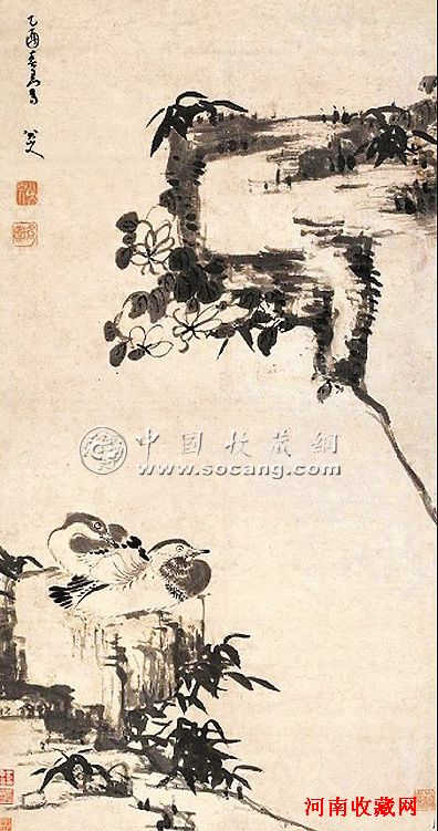 清八大山人《竹石鸳鸯》,立轴中堂,高约120厘米,宽65厘米,以墨笔作于明代灰纸上,创作于1705年,为八大山人晚期风格的代表作。此作构图取对角倚斜之势,画两鸳鸯依偎于山石之上;右上危壁兀立,有芙蓉扎根壁上,旁见侧出,偃仰敷荣;实景相对之间留空,恍若有万顷碧波,极目难测,咫尺之间,意象萧远。此作在杭州西泠2010年秋拍上以1.18亿多元人民币成交。
