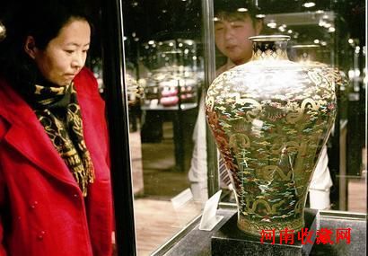 图为观众在欣赏预展的拍卖品“乌金釉堆彩描金云龙纹梅瓶”