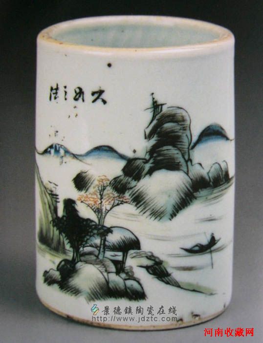 民国 水墨彩山水笔筒