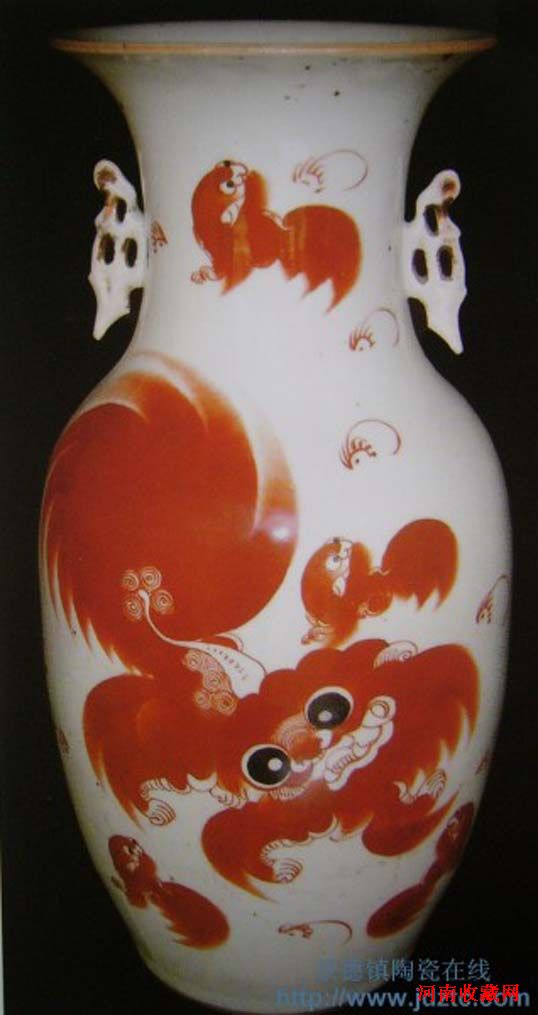 民国时期 太少红狮 江西张荣顺作 双耳大赏瓶