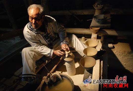 拉坯成型:借助手工技艺把固态瓷泥拉制成坯胎的方式叫做“拉坯成型”,有的坯胎是一次拉成;有的坯胎需要分段拉制,然后用泥浆镶接成型。