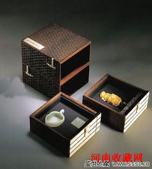 古时文人的文玩盒,原先是用来放置笔、墨、纸、砚等文房用品的。但是随着文玩种类的逐渐增多,其中也开始收纳例如镇纸、印章等,由于数量越来越多,且其中物品的实用性逐渐减弱,而观赏性逐渐增强,因此其也被称为是文人的“玩具箱”。在2009年北京保利的秋拍中,一套书卷式百宝盒及文房珍玩(十六件)以17.92万元成交。 此百宝盒采用书卷式形制,将书卷内部掏空以盛放各色文玩,内分两层,随形放置各类珍玩一十六件,涵盖镇纸、印章、笔舔、烟壶、墨等各种形式,材质也有玉、犀角、玛瑙、瓷器等,皆小巧可爱,颇可把玩,令人爱不释手,别有一番意趣。此种百宝盒是清代时出现的,它集结了历代掌控空间的技巧和经验,以及明代文人对生活的热情与智慧,讲求收藏的品位与理性,将收藏变成一种游戏。