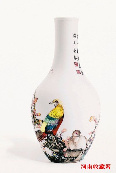 清乾隆御制珐琅彩“锦鸡花石”图胆瓶