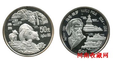 图左:1993年珍稀野生动物(4)-棕熊5盎司银币 图右:1993年马可.波罗5盎司银币
