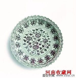 明洪武釉里红开光式“寿菊图”棱口折沿大盘