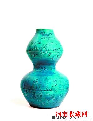 明嘉靖孔雀蓝釉暗划缠枝莲纹“八宝”图葫芦瓶