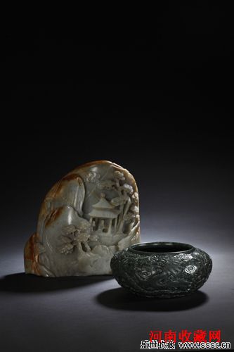 (左)清乾隆 青白玉留皮松亭高士山子 H26cm (右)清乾隆 碧玉雕云龙纹水洗 D21cm