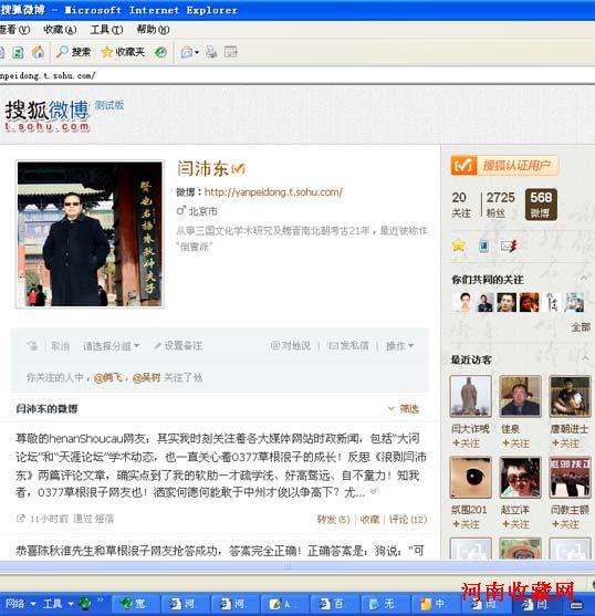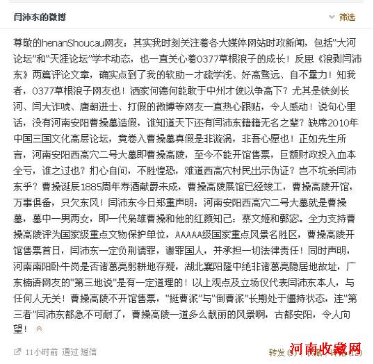 闫沛东的微博 尊敬的henanShoucau网友:其实我时刻关注着各大媒体网站时政新闻,包括“大河论坛”和“天涯论坛”学术动态,也一直关心着0377草根浪子的成长!反思《浪剥闫沛东》两篇评论文章,确实点到了我的软肋-才疏学浅、好高鹜远、自不量力!知我者,0377草根浪子网友也!洒家何德何能敢于中州才俊以争高下?尤其是铁剑长河、闫大诈唬、唐朝进士、打假的微博等网友一直热心跟贴,令人感动!说句心里话,没有河南安阳曹操墓造假,谁知道天下还有闫沛东籍籍无名之辈?缺席2010年中国三国文化高层论坛,竟卷入曹操墓真假是非漩涡,非吾心愿也!正如先生所言,河南安阳西高穴二号大墓即曹操高陵,至今不能开馆售票,巨额财政投入血本全亏,谁之过也?扪心自问,不胜惶恐,难道西高穴村民出示伪证?岂不坑杀闫沛东乎?曹操诞辰1885周年寿酒献爵未成,曹操高陵展馆已经竣工,曹操高陵开馆,万事俱备,只欠东风!闫沛东今日郑重声明:河南安阳西高穴二号大墓就是曹操墓,墓中一男两女,即一代枭雄曹操和他的红颜知己:蔡文姬和鄄宓。全力支持曹操高陵评为国家级重点文物保护单位,AAAAA级国家重点风景名胜区,曹操高陵开馆售票首日,闫沛东一定负荆请罪,谢罪国人,并承担一切法律责任!同时声明,河南南阳卧牛岗是否诸葛亮躬耕地存疑,湖北襄阳隆中绝非诸葛亮隐居地故址,广东楠语网友的“第三地说”是有一定道理的!以上观点及立场仅代表闫沛东本人,与任何人无关!曹操高陵不开馆售票,“挺曹派”与“倒曹派”长期处于僵持状态,连“第三者”闫沛东都急不可耐了,曹操高陵一道多么靓丽的风景啊,古都安阳,令人向望!