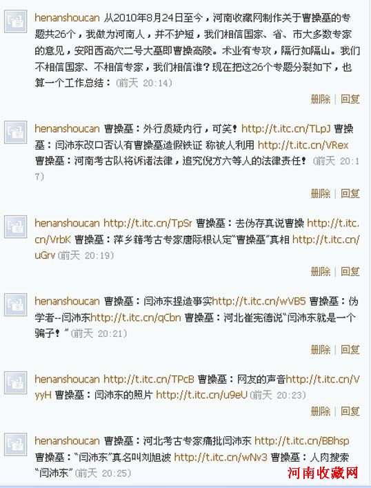 henanshoucan从2010年8月24日至今,河南收藏网制作关于曹操墓的专题共26个,我做为河南人,并不护短,我们相信国家、省、市大多数专家的意见,安阳西高穴二号大墓即曹操高陵。术业有专攻,隔行如隔山。我们不相信国家、不相信专家,我们相信谁?现在把这26个专题分裂如下,也算一个工作总结: