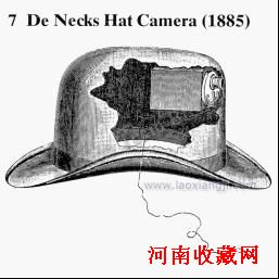 以及拍品号: 20110326-365 的由比利时安特卫普 的N. J. De Neck 制造的礼帽式间谍相机。相机可以放在礼帽的内部,礼帽上留有一个小孔为拍摄所有,快门由一根沿礼帽内壁垂出的细线控制。这是次件珍品世界范围内第2次露面。 预估价在12000-20000欧元。