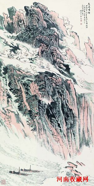 陆俨少先生是近现代山水画巨匠,他独创的陆氏山水画图式及云水线条对中国画的发展作出了重要的贡献。春拍中的《悬流飞翠壁》描绘的是庐山瀑布的壮观景象,正是陆俨少先生盛年所作,画面中线条色彩层次分明,以积墨成块,层层迭迭,满目苍翠、水气弥漫,构图饱满又能通透明亮,是陆俨少先生浑厚而能苍润的代表作,出版于《陆俨少全集》和《2006国际艺术品投资与收藏博览会画册》;《急流归棹》画的更是陆俨少先生最拿手的长江云水风景,其所画之水,离合聚散,屈曲流转,水势迅猛,喷薄回旋而下,极显生气,其漩涡画法,波势湍急,转如车轮,极尽三峡奇险之状,并运用他独创的勾云、留白、墨块等画法表现山石云气,并有意将云峰层层积迭以取势,群峰奔腾扶摇而上,那峥嵘崔嵬的峰峦几乎都朝着一个方向倾斜,从而形成一股排山倒海的雄浑气势,正是陆俨少山水画的突出风貌,本画为陆俨少夫人朱燕因旧藏,出版于《陆俨少画集》及《新加坡秋斋藏画》。
