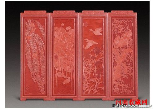 挂屏通体皆髹红漆,大框雕饰卷草花卉与窗格纹,屏心正面雕天、地、水为地,上压雕四季山石花鸟,并提“春风”、“夏雨”、“秋霜”、“冬雪”四款。此插屏雕工精致,漆层肥厚,色彩鲜艳,人物生动。为稀有的宫廷风格艺术珍品。是文乾刚大师的经典作品之一。