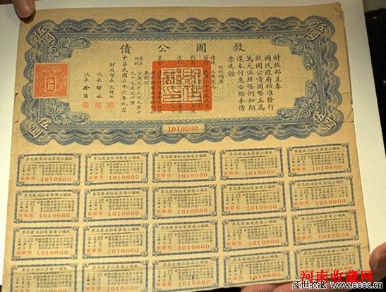 拍卖行工作人员展示一张1937年发行的民国“救国公债”债票