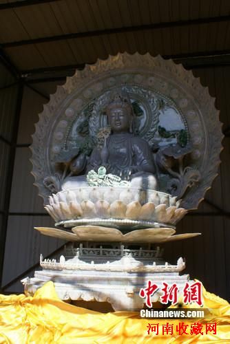 此次安奉的翡翠玉观音为开放莲台坐式观音雕件,原石产于缅甸,颜色呈紫罗兰、绿、浅灰绿等色。大观音端坐在开放莲花台座之上,具大慈大悲之相,显救苦救难之灵。头顶雕饰一小观音,坐于其上。观音后背依托圆形佛光,气势宏大、工艺精湛、风韵雅致,世所罕见。
