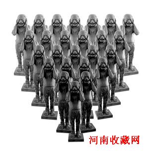 岳敏君作品《现代兵马俑九号》中的二十五座雕像全是画家自己的脸孔