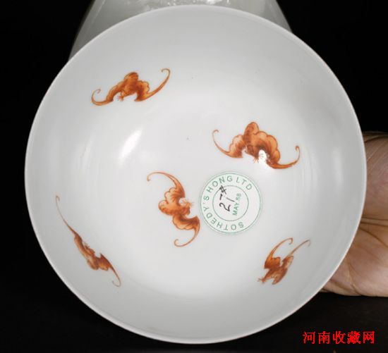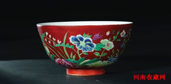 乾隆官窑作品,胎白釉洁,形制规整。外壁以珊瑚红釉为地,用粉彩描绘九秋图画面,各色花草生机蓬勃,鲜花竞放,一片万类霜天竞自由的景象。内壁白釉地上用矾红彩描绘五只蝙蝠,寓意五福齐全。外底署“大清乾隆年制”六字三行青花篆书款。